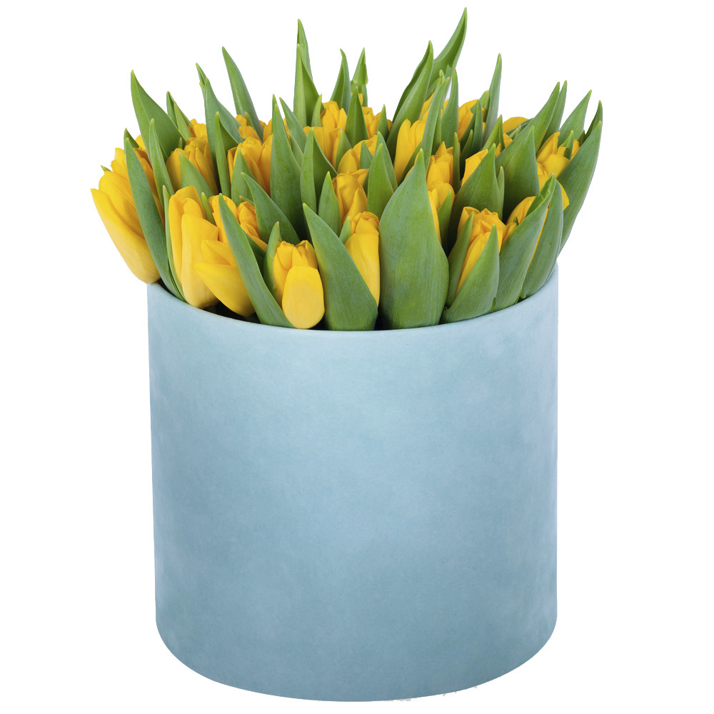 51 желтый тюльпан в зеленой бархатной шляпной коробке