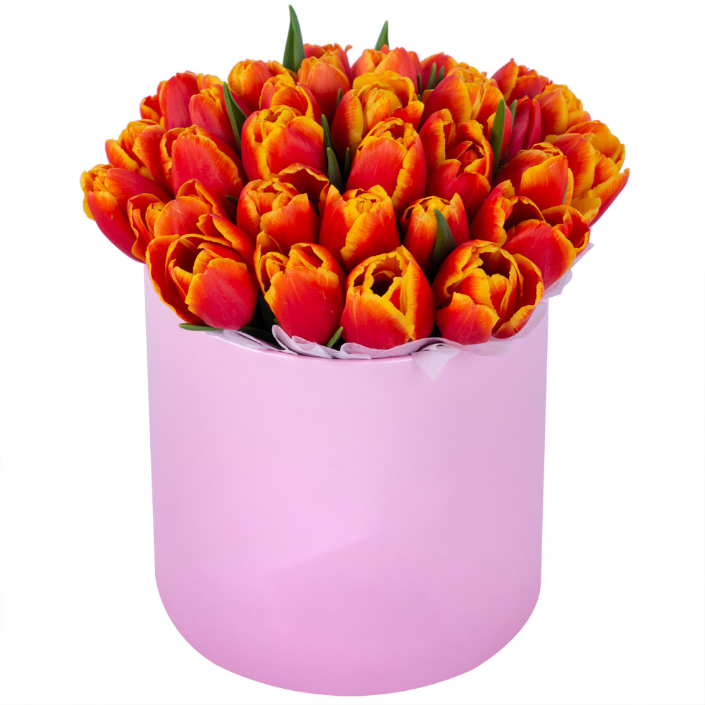 35 огненных тюльпан в розовой шляпной коробке
