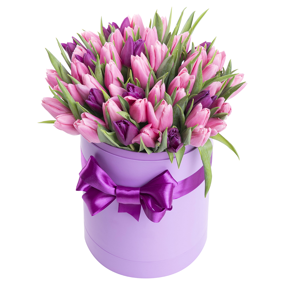 51 разноцветный тюльпан в шляпной коробке