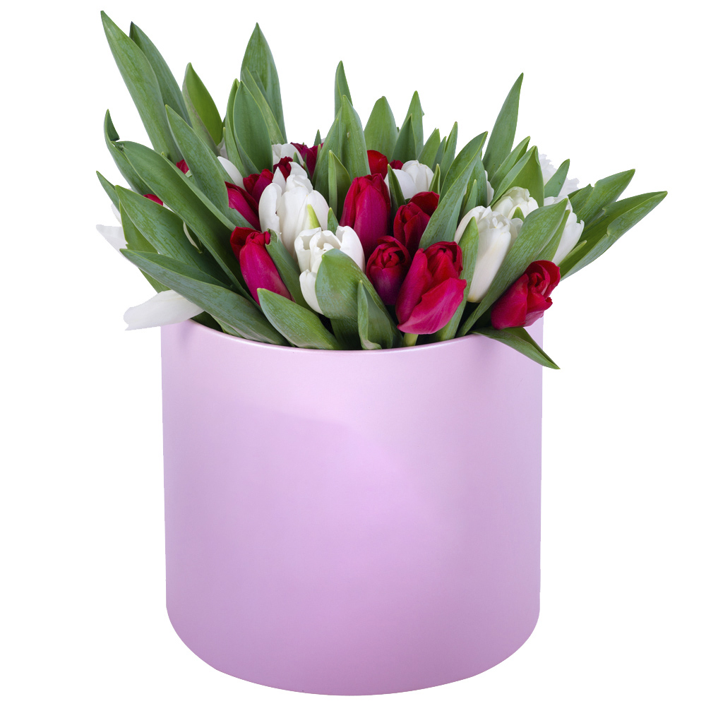 51 Разноцветный тюльпан в розовой шляпной коробке
